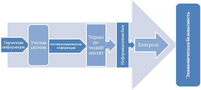 Таким образом, создание системы интегрированного учета, подстроенного под задачи экономической безопасности, обеспечение корректного обобщения всех фактов хозяйственной жизни с учетом получения необходимых данных для контроля угроз, является основой для эффективного функционирования экономической безопасности. Системы учета и анализа совместно и последовательно в рамках единой интегрированной системы учета должны создавать информационную базу для эффективного управления всей деятельностью предприятия и обеспечения его экономической безопасности.