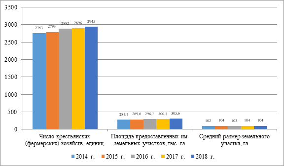 На данном этапе в России актуальность развития сельскохозяйственной и потребительской кооперации в повышении качества жизни в сельской территории возрастает в связи с наличием большого числа крестьянских (фермерских) хозяйств. В структуре сельскохозяйственных организаций страны по формам хозяйствования на начало 2019 г. имелось сельскохозяйственных кооперативов - 21,5%, публичных акционерных обществ - 2,1%, непубличных акционерных обществ - 7,6%, обществ (товариществ) с ограниченной ответственностью - 60,1%, государственных организаций - 2,1%, прочих организаций - 6,6%. Основной базой для закупочной деятельности потребительской кооперации Центросоюза Российской Федерации, для формирования и развития сельскохозяйственных потребительских кооперативов выступают малые формы хозяйствования на селе, среди них особое место занимают крестьянские (фермерские) хозяйства, которые в последние годы получают существенную государственную поддержку и успешно развиваются. Так, в Республике Татарстан численность крестьянских (фермерских) хозяйств с 2014 по 2018 гг. увеличилась с 2753 до 29454 единиц, или на 7%. За этот период возросла площадь предоставленных им земельных участков 281,1 до 305,6 тыс. га, или на 8,7%. Средний размер земельного участка в распоряжении каждого фермера увеличился на 2 га (рисунок 1).