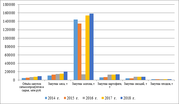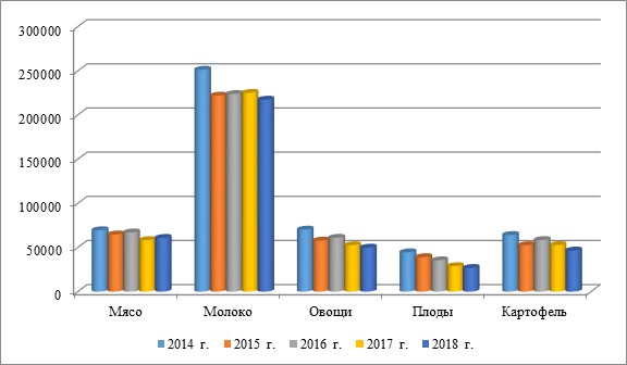 Важнейшей чертой развития сельских территорий в Республике Татарстан в современных условиях является кооперирование крестьянских хозяйств, расширение закупочно-сбытовой деятельности потребительской кооперации. Следует заметить, что в целом Центросоюз России с 2014 по 2018 гг. уменьшил закупки сельскохозяйственной продукции в целом по стране: мяса - 69501 до 60836 т, или на 12,5%, Молока- с 251173 до 217347 т, или на 13,5%, овощей – с 70239 до 49833 т, или на 29,1%, плодов с 44508 до 26797 т, или на 39,8%, картофеля с 64076 до 46569 т, или на 27,3% (рисунок 2).