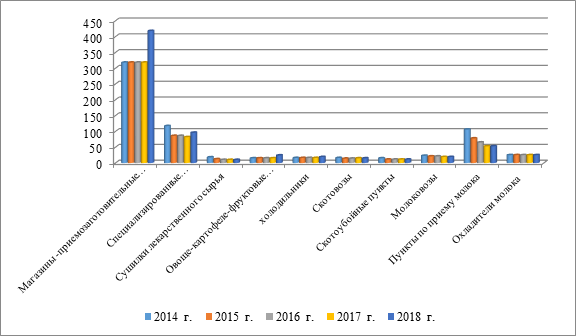 В настоящее время в большинстве потребительских обществ Республики Татарстан проводится модернизация и реконструкция имеющейся материально-технической базы, строятся новые и модернизируются действующие производственные мощности, укрепляются рыночные взаимоотношения с сельскохозяйственными производителями, укрепляются кооперационные связи с личными подсобными и крестьянскими (фермерскими) хозяйствами. Всё это способствует активизации работы мелкого аграрного бизнеса, что повышает уровень развития сельской территории, придает новый импульс развитию социально-экономической инфраструктуры сельской местности. Конкретным проявлением участия потребительской кооперации в развитии инфраструктуры сельской территории является развитие кооперативной материально-технической базы в сфере закупок сельскохозяйственной продукции и сырья. Так, в сельской местности Республики Татарстан действует 418 магазинов, выполняющих помимо прямой обязанности функции приемозаготовительных пунктов, принимая у населения сельскохозяйственные продукты. Устойчиво функционируют 96 специализированных приемозаготовительных пунктов, оборудованных необходимыми механическими средствами. К перерабатывающим промыслам можно отнести 10 сушилок лекарственного сырья, которые обрабатывают поступающее от населения сырье лекарственных трав и другие продукты, закладывают его на хранение с дальнейшей доставкой в систему торговой торговли и на предприятия по более углубленной переработке. С 2014 по 2018 гг. в системе потребительской кооперации республики увеличилось число овоще-картофеле-фруктовых хранилищ с 15 до 24, или на 60%. За рассматриваемый период возросло количество холодильников, обеспечивающих сохранность заготавливаемых продовольственных товаров и сырья. Существенным подспорьем в укреплении материальной оснащенности потребительской кооперации в сельской территории выступают действующие 15 скотовозов, 11 скотоубойных пунктов, 19 молоковозов, 53 пункта по приему молока и 25 охладителей молока (рисунок 4).