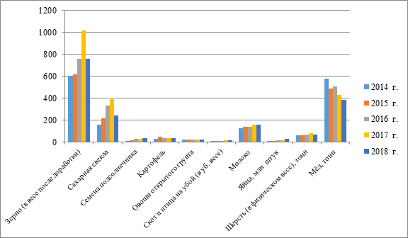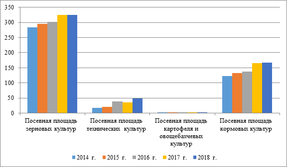 На развитие сельской территории оказывает влияние деятельность крестьянских (фермерских) хозяйств по выращиванию сельскохозяйственных культур, размеры посевных площадей, тенденции объемов производства продовольственных товаров. В Республике Татарстан с 2014 по 2018 гг. все посевные площади сельскохозяйственных культур в крестьянских (фермерских) хозяйствах увеличились с 425,2 до 543,2 тыс. га, или на 27,8%, в том числе посевная площадь зерновых культур - с 283,9 до 325,1 тыс. га, или на 14,5%, технических культур – с 17,3 до 48,7 тыс. га, или в 2,8 раза, картофеля и овощебахчевых культур – с 2,2 до 2,6 тыс. га, или на 18,2%, посевная площадь кормовых культур возросла с 121,8 до 166,8 тыс. га, или на 36,9% (рисунок 5).