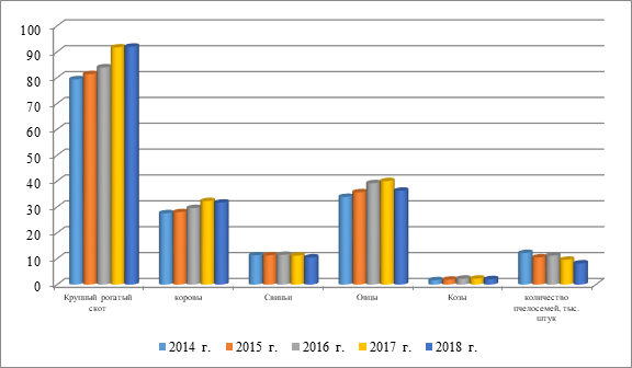 Значительную работу проводят малые формы хозяйствования Республики Татарстан по развитию отраслей животноводства. Так, с 2014 по 2018 гг. численность поголовья крупного рогатого скота в крестьянских (фермерских) хозяйствах увеличилась с 79,4 до 92,0 тыс. голов, или на 15,9%, поголовье коров возросло с 27,6 до 31,7 тыс. голов, или на 14,9%. В сельской местности Республики /Татарстан с каждым годом увеличивается численность мелкого рогатого скота овец и коз. Так, только в крестьянских (фермерских) хозяйствах с 2014 по 2018 гг. поголовье овец увеличилось с 33,9 до 36,3 тыс. голов, или на 7,1%, численность коз за это время возросла с 1,7 до 2,1 тыс. голов, или на 23,5%. Наряду с этим фермеры занимаются разведением свиней и пчел (рисунок 6).