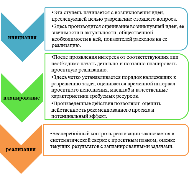 Каждый произведенный проект имеет собственный «жизненный» цикл, в котором он последовательно проходит по трем ступеням (рисунок 3), наделенным особыми свойствами, рычагами и приемами проектного менеджмента.