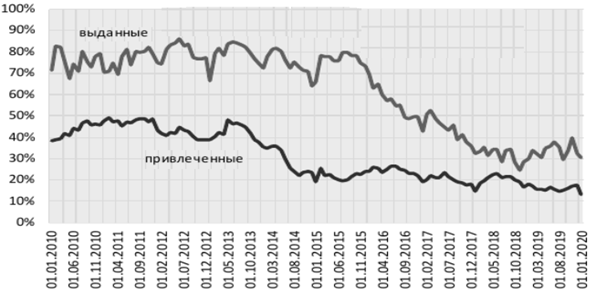 Рисунок 2 – Динамика участия банков – нерезидентов в движении кредитной денежной массы в России [7]