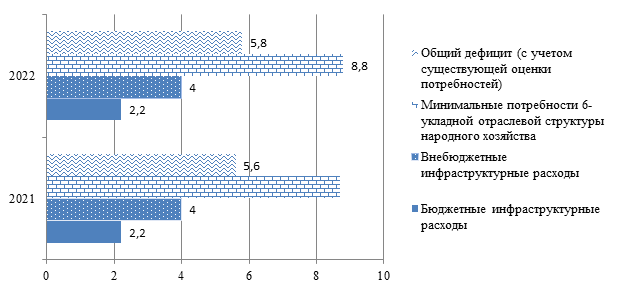 Рисунок 3 – Прогноз инфраструктурных расходов отраслевого развития в России и оценка инфраструктурных потребностей в 2021-2022 гг., в % от ВВП. Составлено авторами на основе [8]