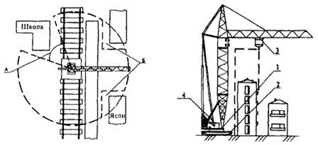 Рис. 1. Схема действия системы ограничения зон работы башенного крана.