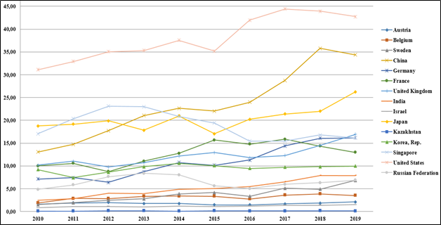 Лидером по данному показателю является США: в 2019 г. – 42.73 млрд. долл. США, на втором месте Китай – 34,37 млрд. долл. США. У России данный показатель составил 6.87 млрд. долл. США, что в 6 раз меньше показателя Соединенных штатов. За рассматриваемый период наибольший прирост исследуемого показателя в Швеции (356.88%), Индии (223.57%), Китае (163.59%) и Германии (126.96%). Прирост объема платежей за использование интеллектуальной собственности в России за 9 лет составил 41.81%.