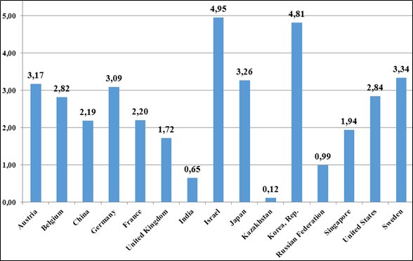 Рисунок 3 – Доля расходов на исследования и разработки в ВВП за 2018г., % [11]