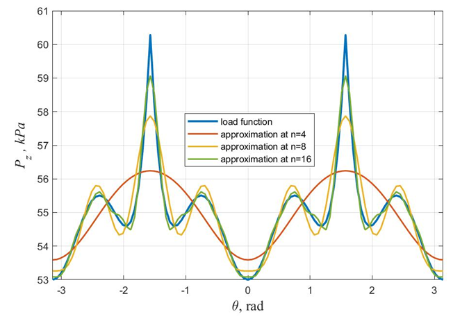 Figure 2. Change in the normal component of the load depending on θ and approximation of the function W(θ) using a series