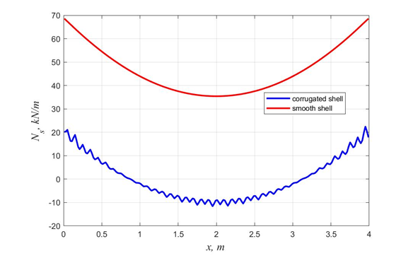 It can be seen from Fig. 5 that the meridional force Ns for the corrugated shell turns out to be significantly lower than for the smooth one. At the same time, for the annular force Nθ along the length of the corrugated shell, oscillations with a large amplitude are observed. The maximum values of the shear force Nsθ for the corrugated shell are slightly higher than for the smooth one; the graph of its change along the length at θ = π / 4 is shown in Fig. 7.