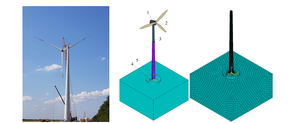 Рисунок 6. Конструктивная схема (компьютерная модель в ПК «Ansys») ВЭУ на 2 МВт: 1 – гондола; 2 – лопасти ротора; 3 – башня; 4 – сборно-разборный фундамент; 5 – грунт основания