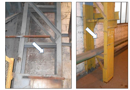 Погибы элементов базы колонны. Распространенное повреждение, чаще всего встречается на крановых эстакадах. Причинами появления погибов в элементах базы являются транспортные нагрузки – это удары автомобилем или удары краном при перемещении груза. Техническое состояние колонны с погибами элементов базы является ограниченно работоспособным. Продолжения данные повреждения, как правило, не имеют, соответственно техническое состояние с течением времени не меняется. Устраняется повреждение путем рихтовки элементов и усилением привариванием накладки.