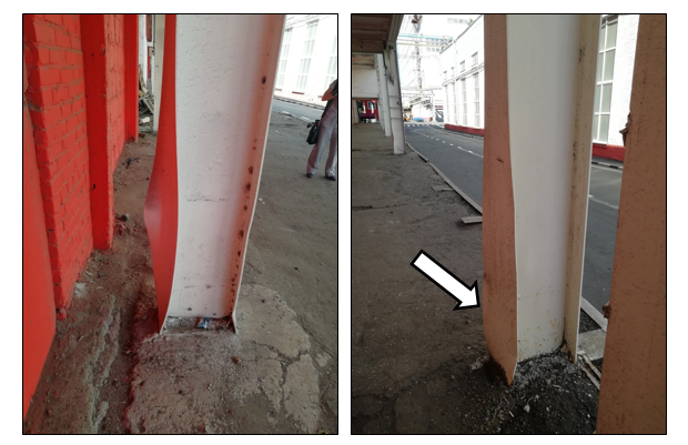 Известен случай, в здании котельного цеха городской электростанции в производственном процессе регулярно проводится промывка котлов от шлака и несгоревших частиц угля. Воду из котлов сливают в отводные каналы в полу здания, однако каналы забиваются, и большой поток воды протекает по полу помещения, забивая базы колонн угольной крошкой, что приводит к образованию застоя влаги в базах колонн (рис. 1). Многолетнее скопление влажной угольной крошки и регулярное замачивание привело к слоистой коррозии колонн здания цеха и потере площади поперечного сечения от 15 до 30%. Техническое состояние колонн цеха было признано недопустимым, в рекомендациях по результатам обследования было указано выполнить очистку баз колонн пескоструйными агрегатами и выполнить обетонирование баз для предотвращения повторного замачивания и замусоревания. По прошествии пяти лет с момента проведения обследования рекомендации остались не выполненными.