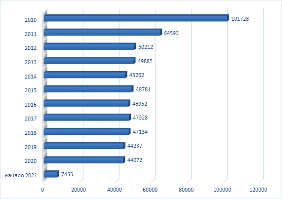 На рисунке 1 представлена динамика изменения выявленных преступлений в экономической сфере за период с 2010 года по 2021 год.