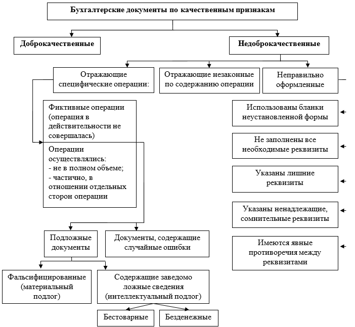 По качественным признакам документы могут быть либо доброкачественными, либо недоброкачественными. Для наглядности на рисунке 6 схематично представлена классификация бухгалтерских документов по качественным признакам.
