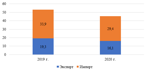 Показатели товарооборота России в 2020 г. (рис.1), который был именован как кризисный для всего мирового пространства, по группе «Продукция химической промышленности» составили $45.5 млрд (из них экспорт - $16.1 млрд, импорт - $29.4 млрд), данные показатели снизились по сравнению с аналогичным периодом прошлого года на 14.4%.