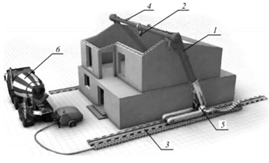 Рис. 1 – Система для печати зданий с помощью 3д принтера: 1 – сопло (экструдер), 2 – рама; 3 – направляющие вдоль здания; 4 – механизм передвижения сопла; 5 – устройство для поднятия конструкции принтера; 6 – автобетоносмеситель для подачи цементного состава [4]