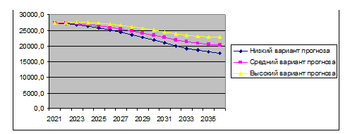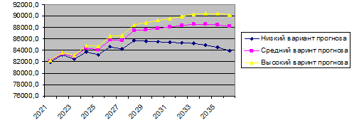 На рисунках 1, 2 и 3 рассмотрены изменения численности населения по вариантам прогноза на 2021 по 2035 годы трудоспособного возраста, моложе и старше его [2].