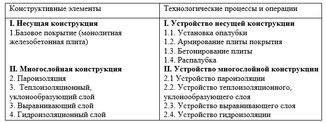 Для определения состава и последовательности технологических операций устройства и ремонта оснований кровельных покрытий использованы проектные конструктивные и организационно технологические решения. Декомпозиция на отдельные конструктивные элементы конструктивного решения основания кровельного покрытия с теплоизоляционным слоем из полистиролбетона позволила выполнить описание последовательности при производстве работ на строительной площадке и сформировать состав соответствующих технологических процессов и операций (табл. 1).
