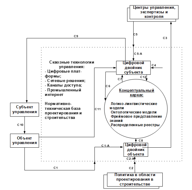 Основными взаимосвязями между объектом и субъектом управления проектной организации, возникающими в процессе цифровизации и внедрения цифровых двойников и сквозных технологий, являются следующие: С1 – сообщения, характеризующие объект управления; С 1-А – сообщения, характеризующие объект управления после формализации (BIM-модель объекта строительства + полный комплект ПСД + онтологическая модель бизнес-процессов); С2 – информационный поток определяемый государственными и муниципальными решениями в строительной отрасли; С2-А – информационный поток развития строительного комплекса после формализации; С3 – передача данных для мониторинга состояния объекта во внешние центры управления, экспертизы и контроля с целью управления рисками; С4 – передача данных для мониторинга состояния объекта цифровому двойнику субъекта; С5 – сообщения о концептуальных решениях на основании данных мониторинга состояния; 5’ – сообщения о концептуальных решений на основании данных мониторинга состояния после формализации;
