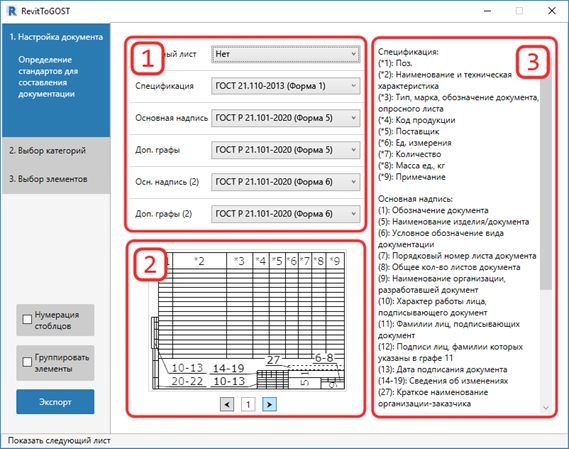 Элементы управления вкладки 1 приведены на рис. 3, где выделены выпадающие списки с вариантами ГОСТов (1), окно предпросмотра (2) и пояснения к текущему виду предпросмотра (3).