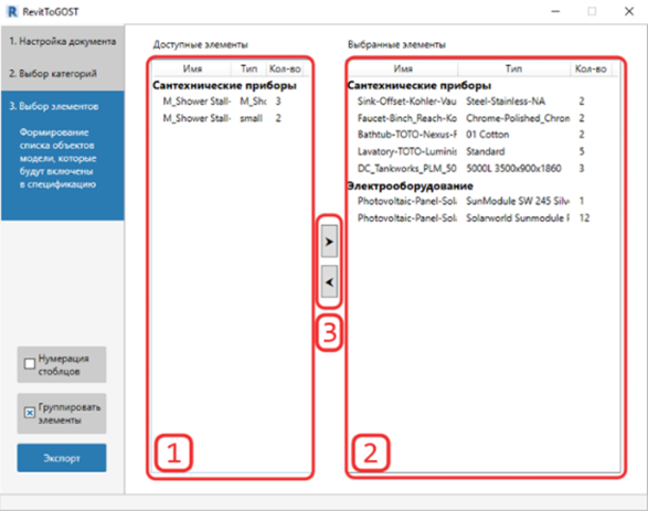 Аналогичным образом представлены элементы управления вкладки 3 «Выбор элементов» (рис. 5): список доступных для экспорта элементов (1), выбранные элементы (2) и инструменты выбора (3).
