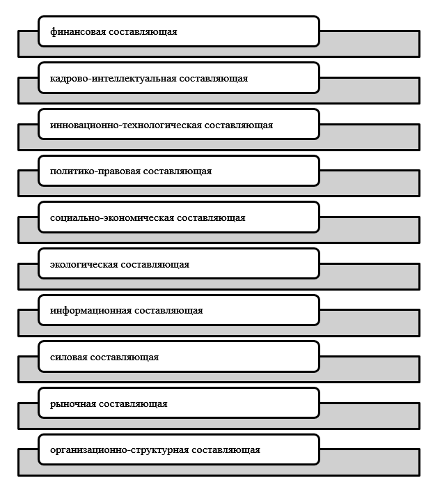 На уровне государства выделяют следующие функциональные составляющие экономической безопасности: уровень жизни населения; управление экономикой на всех уровнях; развитие производительных сил и так далее. Угрозами экономической безопасности определены процессы и явления, негативно воздействующие на экономическое состояние государства, ограничивающие интересы субъектов экономической безопасности, создающие опасность национальным ценностям.