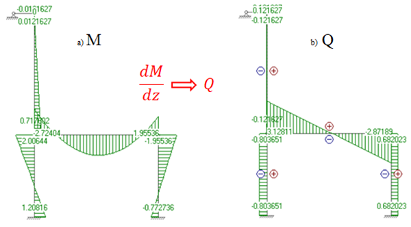 Рис. 2 Графики изгибающих моментов М (а) и графики перерезывающих сил Q (b) анализируемой системы