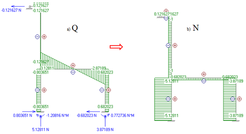 Рис. 3 Построение графиков продольных сил N (b) на основе графиков перерезывающих cил Q(a) для анализируемой системы