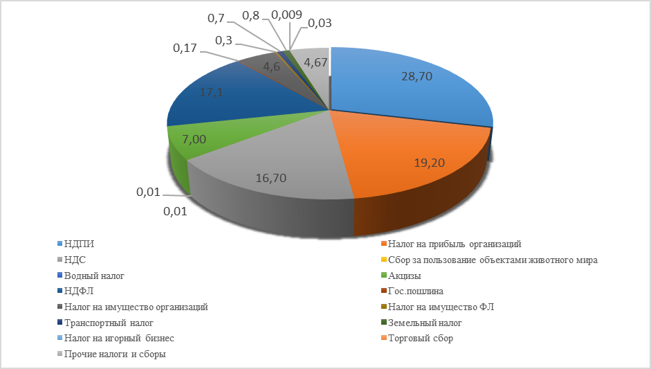 Таким образом, диаграмма иллюстрирует, что наибольшая доля налоговых поступлений в консолидированном бюджете Российской Федерации в 2019 г. приходится на НДПИ, налог на прибыль и НДС. При этом, значительна доля косвенных налогов (НДС и акцизы).