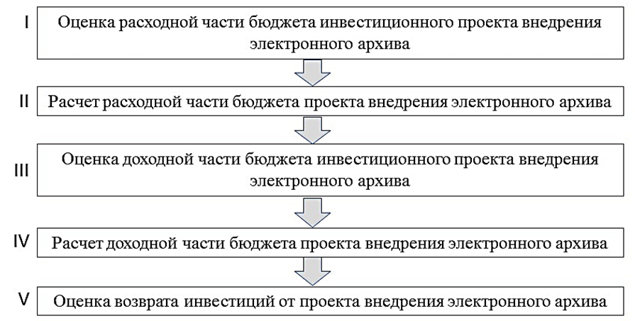 Оценка экономической эффективности проекта внедрения электронного архива в компании должна включать в себя несколько этапов или блоков работ [7, 8] (рис. 2)