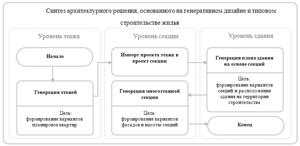 Во втором случае рассмотрена методика комплексного использования генеративного дизайна при создании объемно-планировочных решений многоэтажных жилых зданий [21]. Методика использует возможности применения типового и модульного строительства. Предложено многократное использование генеративного дизайна на различных структурных уровнях жилого здания (на уровне этажа, на уровне секции, на уровне всего здания (рис. 3).
