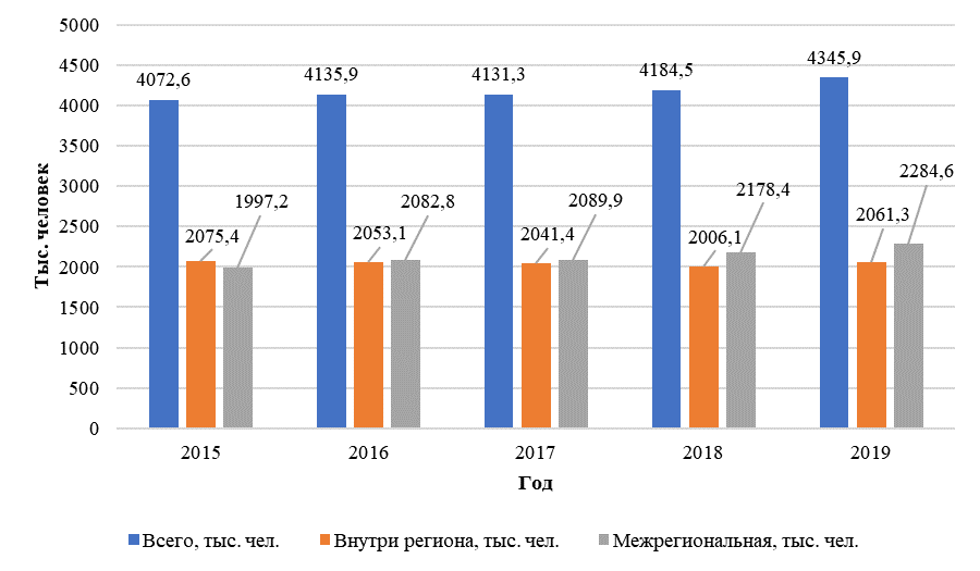 Если рассматривать направление внутренней миграции, то можно заметить, что на 2015 год внутрирегиональная миграция несколько выше межрегиональной (2 075,4 тыс. человек против 1 997,2 тыс. человек). Однако, начиная с 2016 года абсолютное значение межрегиональной миграции выше, чем внутрирегиональной.