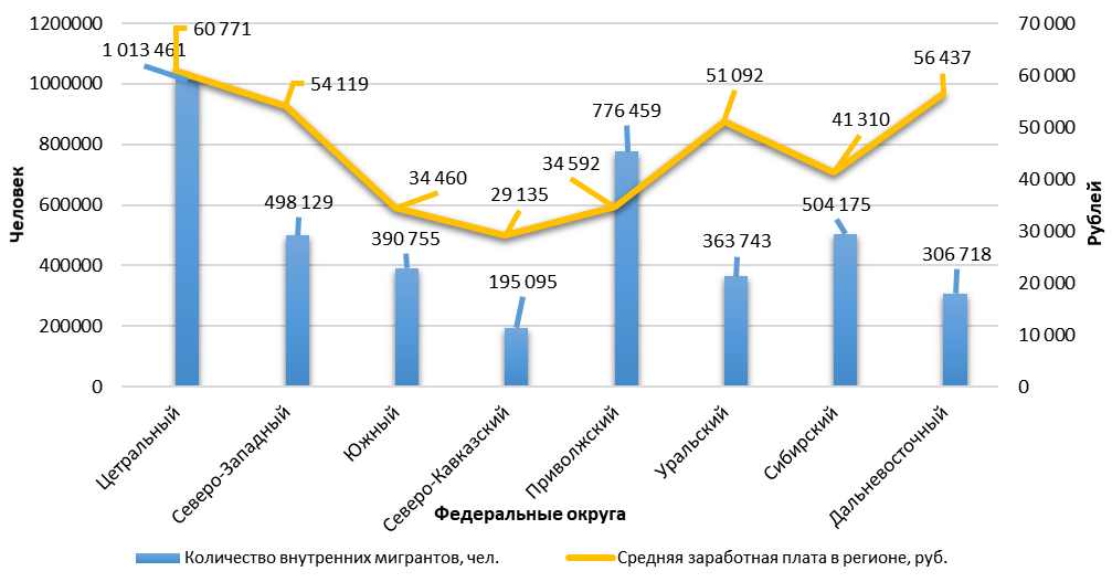 Анализ количества внутренних мигрантов и средней заработной платы в регионе не вывил прямой зависимости между показателями. Так, для отдельных регионов заработная плата является наиболее важным показателем для притока мигрантов, в частности мы это видим по Центральному, Приволжскому и Сибирскому федеральным округам, а для других регионов размер зарплаты не является ключевым для притока мигрантов из других федеральных округов, например, в Уральском и Дальневосточном федеральных округах. Анализ процессов внутренней миграции позволяет ученым говорить о невысокой мобильности населения России, что не даёт возможности национальной экономике использовать её для решения текущих проблем на рынке труда [5, С. 5].