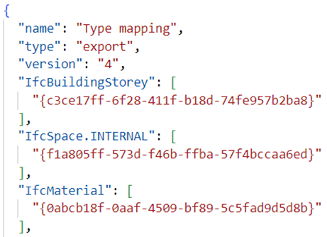 Файл сопоставления типов позволяет сопоставить целиком все объекты, выполненные определённым инструментом Renga, соответствующим классам IFC, например Стена – IfcWall, Колонна – IfcColumn, Перекрытие – IfcSlab и т.д. Данная операция возможна, благодаря тому, что в Renga есть соответствующие константы инструментов объектного моделирования (идентификатор на все объекты, выполненные определённым инструментом). Синтаксис Json в данном случае использует форму – массив. Пример файла сопоставления типов приведён на Рис. 4.