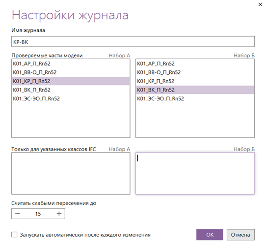 Рис. 17. Настройки журнала проверки на коллизии пересечения
