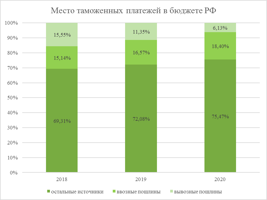Стоит отметить снижение роли экспортных таможенных платежей в формировании доходной части бюджета страны, что является полезным фактором, так как экспортные пошлины в РФ установлены в основном на сырье и ценные не возобновляемые природные ресурсы.