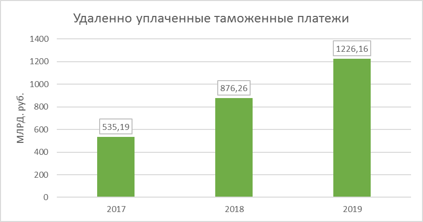 Стоит также отметить то, что за 2019 год сумма таможенных и иных платежей, уплаченных с применением технологии удаленной уплаты, составила 1226,16 млрд. рублей (21,4% от общей суммы таможенных и иных платежей, перечисленных в федеральный бюджет) и увеличилась по сравнению с показателем 2018 года на 39,9% (в 2018 году – 876,26 млрд. рублей).