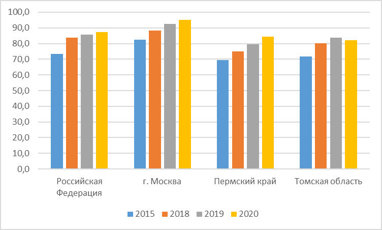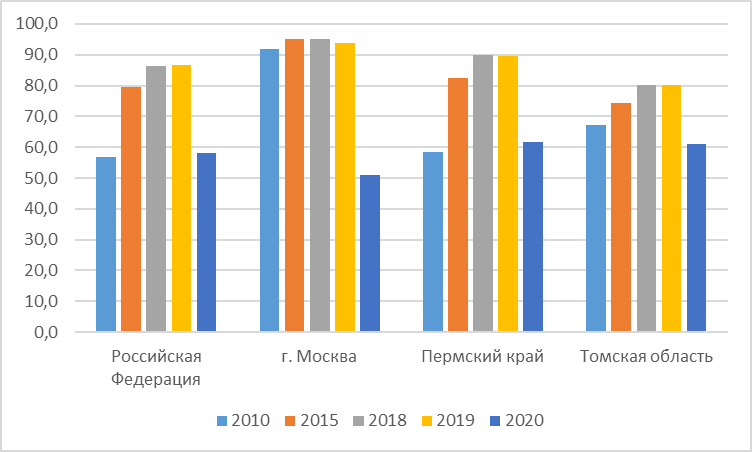 Одним из ключевых критериев цифровой трансформации является показатель использования широкополосного доступа к сети интернет. На рисунке 5 приведены данные об использовании широкополосного доступа в г. Москва, Пермском крае, Томской области и Российской Федерации в целом.