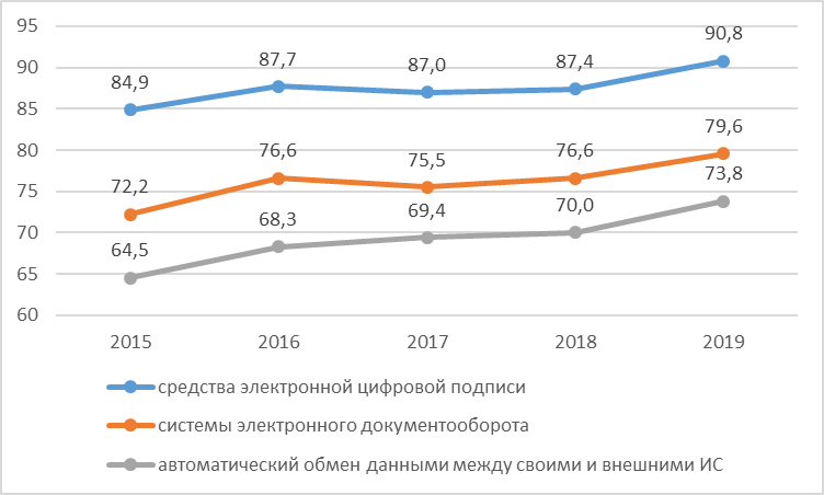Можно отметить существенный рост применения информационных средств, используемых в деятельности государственных и муниципальных служащих, являющийся существенным фактором повышения производительности труда и скорости документооборота за счет реализации целого ряда программных мероприятий по цифровизации управленческого процесса.