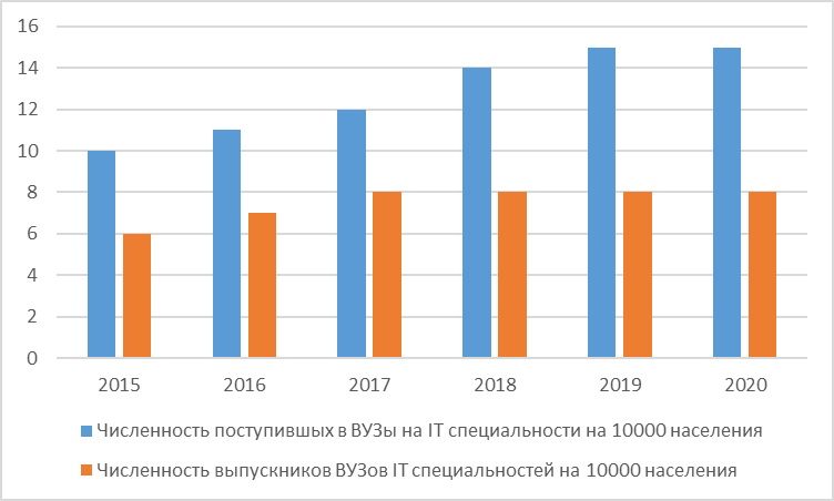 На рисунке 2 отражены сведения о численности поступивших студентов и выпускников ВУЗов в сфере информационных технологий в Российской Федерации за 2015-2020 гг.
