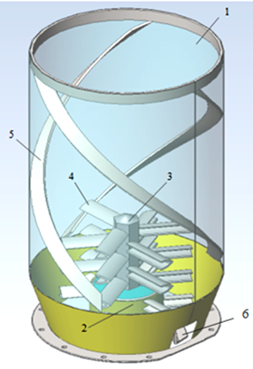 Рис.1. Диспергидратор.1- смесительная емкость; 2- приводной вал; 3- вал; 4- лопасти; 5- отбойник; 6 − патрубок для истечения газобетонной смеси.