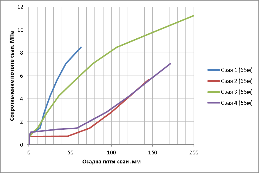 Данные результаты показали, что сопротивление грунта по подошве сваи имеет различные значения: при осадке 25мм максимальная разница (между сваями 1 и 2) достигает 4-х раз!