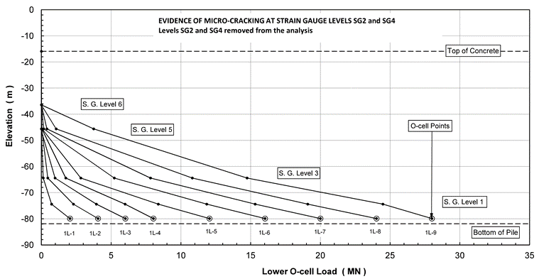 При нагружении верхнего уровня домкратов наблюдается резкое затухание напряжений в прочных слоях грунта на отметках -25…-80 м. С увеличением нагрузки происходит перераспределение усилий по стволу сваи и вовлечение в работу относительно слабых грунтов на отметках (+3…-40).