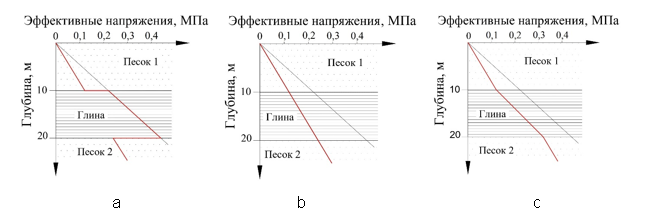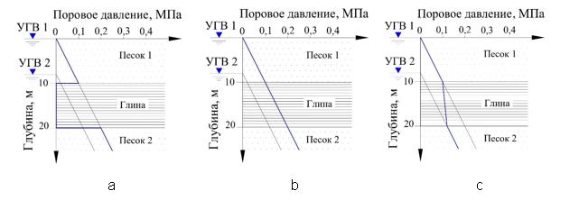 Рис. 2. Принципиальные схемы расчета изменения вертикального эффективного напряжения в слое СФГ: a - при поровом давлении, в СФГ равным нулю, b - при распределении порового давления по гидростатическому закону; c – при определении порового давлении методом линейной интерполяции