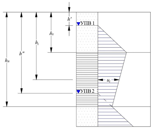 На рис. 3 представлена схема к расчету порового давления методом линейной интерполяции. Условный слой СФГ на схеме расположен между верхним и нижним водоносными горизонтами, которым соответствуют уровни подземных вод – УПВ 1 и УПВ 2.