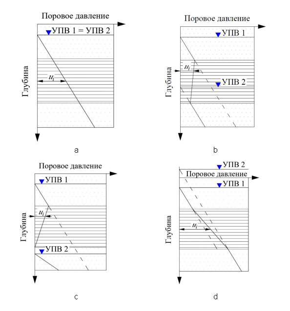 Рис. 4. Принципиальные схемы распределения порового давления при различном положении положения уровней подземных вод относительно слоя СФГ: а – УПВ над кровлей и под подошвой СФГ слоя равны; b –УПВ 2 внутри слоя СФГ; c –УПВ 2 ниже отметки подошвы СФГ слоя; d –УПВ 2 выше уровня УПВ 1