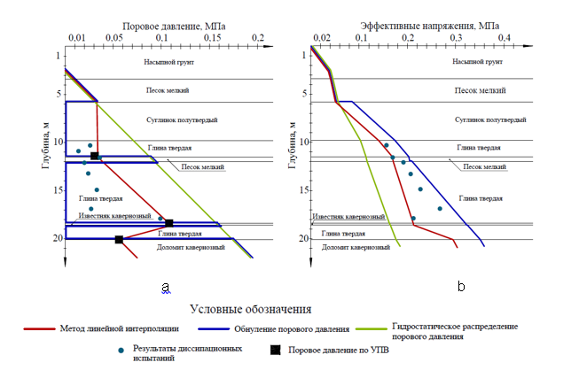 Необходимо также отметить, что значения порового давления, полученные методом интерполяции, оказались выше, чем результаты измерений методом диссипации, а значит расчетные значения эффективного напряжения по методу интерполяции будут ниже (рис. 5, b), что работает в сторону повышения фактора безопасности.
