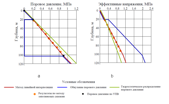 Значения природного порового давления до начала строительства, определенные методом «заполняемых скважин», на рис. 6, а. показаны точками. Здесь же представлены графики распределения порового давления и эффективного вертикального напряжения, полученные тремя расчетными методами.