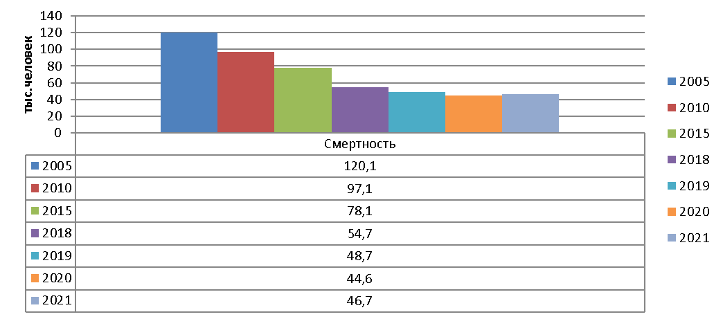 Следует учитывать, что в последние годы число смертей было выше, чем количество рождаемости на территории Российской Федерации. Естественная убыль населения, рассчитывается как разница между смертями и рождаемостью, составила около 1 млн. в 2021 году. А, коэффициент смертности увеличился с 14,6 в 2020 году до 16,7 в 2021 году [8].